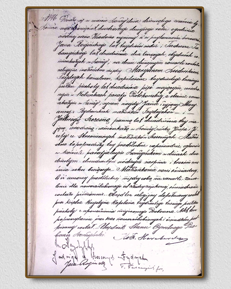 Akt ślubu, zawartego 09 września 1922 roku w łomżyńskim kościele katedralnym pomiędzy Jadwigą Szczęsną i kapitanem łomżyńskiego 33 Pułku Piechoty Marianem-Ludwikiem Frydrychem - urodzonym 14 sierpnia 1897 roku w Koluszkach, w pow. piotrkowskim /synem Jana i Marianny Wielgat-Rydzewskiej z męża Frydrych /.