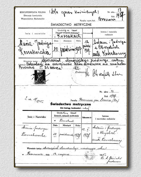 Akt urodzenia i chrztu Marii-Jadwigi Kossakowskiej.