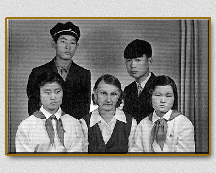 Płakowice - powiat lwówecki na Dolnym Śląsku , 1956 rok. Maria Szanter ze swoimi uczniami: Son Jon Sin i Jon Sun - koreańskimi sierotami.