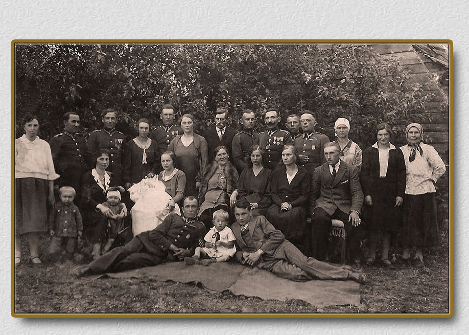 Sierpień, 1931 roku. Zdjęcie z galowych chrzcin - zorganizowanych dla uhonorowania narodzin pierwszego syna Marii i Antoniego Szanterów - Edwarda, urodzonego w Skrobotunach , 03 lipca 1931 roku. Zaproszono na nie oficerów batalionu Korpusu Ochrony Pogranicza „Podświle”, - Brygady KOP „Wilno” - ze strażnicy KOP, znajdującej się w miejscowości Prozoroki. Mężczyzna w garniturze - stojący w środku fotografii - to Jan Sieńkowski, ojciec Marii Szanter. Pierwsza kobieta siedząca na ławce - od prawej - to Maria Szanter / z domu Sienkowska/. Druga kobieta od Marii to Franciszka Czyba, siostra Antoniego Szantera - męża Marii. Trzy kobiety stojące po prawej stronie zdjęcia są też siostrami Antoniego Szantera. Pierwsza z prawej to Malwina, druga to Marcysia a trzeciej imienia nikt nie może sobie przypomnieć. Na drugim planie zdjęcia stoją umundurowani oficerowie strażnicy granicznej, Korpusu Ochrony Pogranicza - powiatu dziśnieńskiego, która znajdowała się nieopodal Skrobotun.