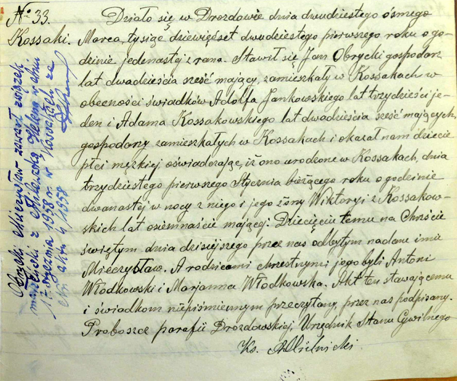 Akt urodzenia i chrztu Mieczysława Obryckiego w dniu 28 marca 1921 roku, w kościele w Drozdowie .