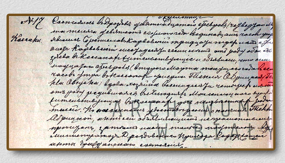 Kopia oryginału aktu zgonu Tekli Obryckiej /z d. Chludzińskiej/ - matki Romana Obryckiego, żony Jana-Leona - zmarłej 17 lutego 1907 roku.