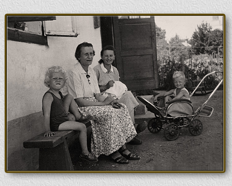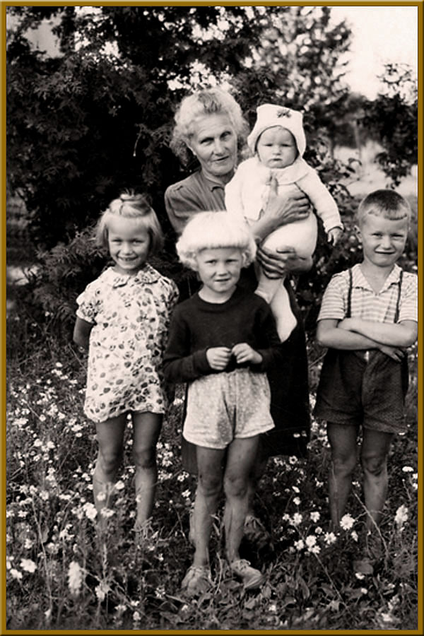 Elżbiecin, lato 1957 roku. Od lewej: Elżbieta Szczęsna, Waldemar Jacek Obrycki, babcia - Zofia Szczęsna /z d. Sieńkowska/ - z Marianem Obryckim na rękach - i Bohdan Szczęsny.
