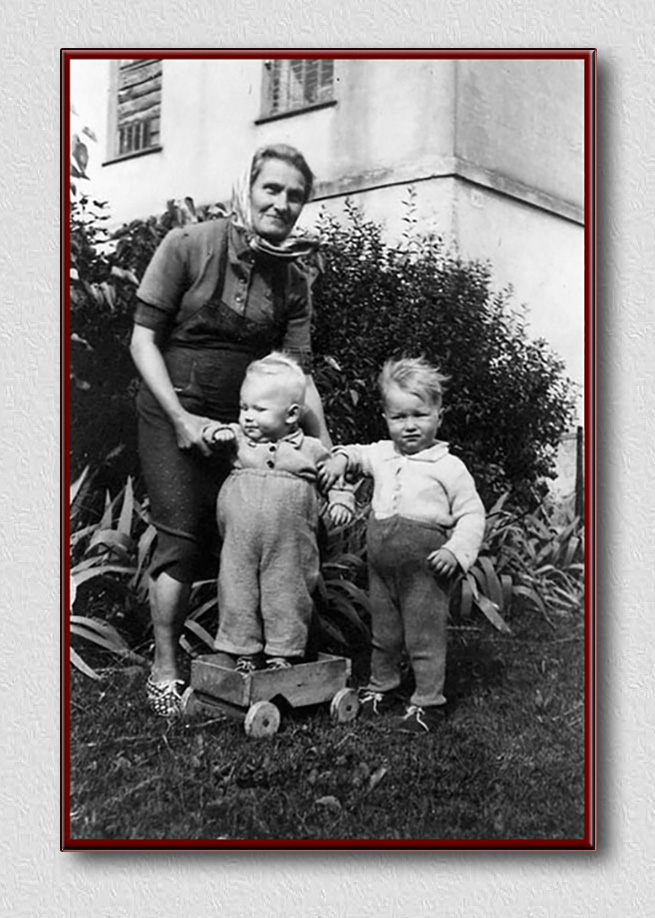 Elżbiecin, czerwiec 1952 roku. Od lewej: babcia Zofia Szczęsna - matka Jerzego Szczęsnego /ojca Bohdana/, Waldemar - Jacek Obrycki i Bohdan Szczęsny.