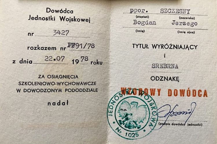 Jego pierwszym wyróżnieniem był nadany - w 1978 roku - tytuł i srebrna odznaka Wzorowego Dowódcy.