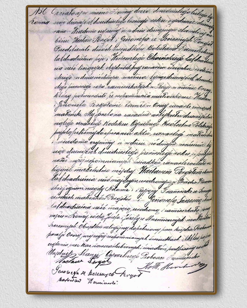 Kopia potwierdzenia zawarcia katolickiego ślubu przez Genowefę-Annę Szczęsną z Wacławem Pergoł /synem Adama i Franciszki z domu Smugarzewskiej/ w kościele, w Orszy - na Białorusi, sporządzona w łomżyńskiej katedrze, w dniu 20 lutego 1923 roku.