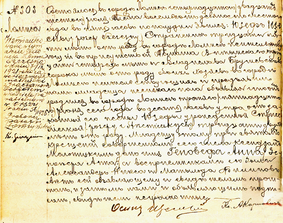 Łomża, 25 lipca 1923 roku. Akt urodzenia i chrztu Natalii-Haliny Pergoł - córki Wacława i Genowefy-Anny Pergoł z domu Szczęsnej - urodzonej 12 lutego 1923 r. w Łomży. Rodzicami chrzestnymi Natalii-Haliny byli Jadwiga Frydrych-Szczęsna - siostra Genowefy-Anny i Leon Wilczewski.