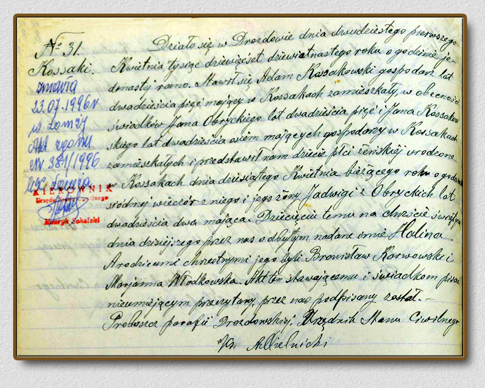 Akt chrztu i urodzenia Haliny Kossakowskiej /później z męża Pusz/ urodzonej w Kossakach - Ponikly Stok w parafii Drozdowo .