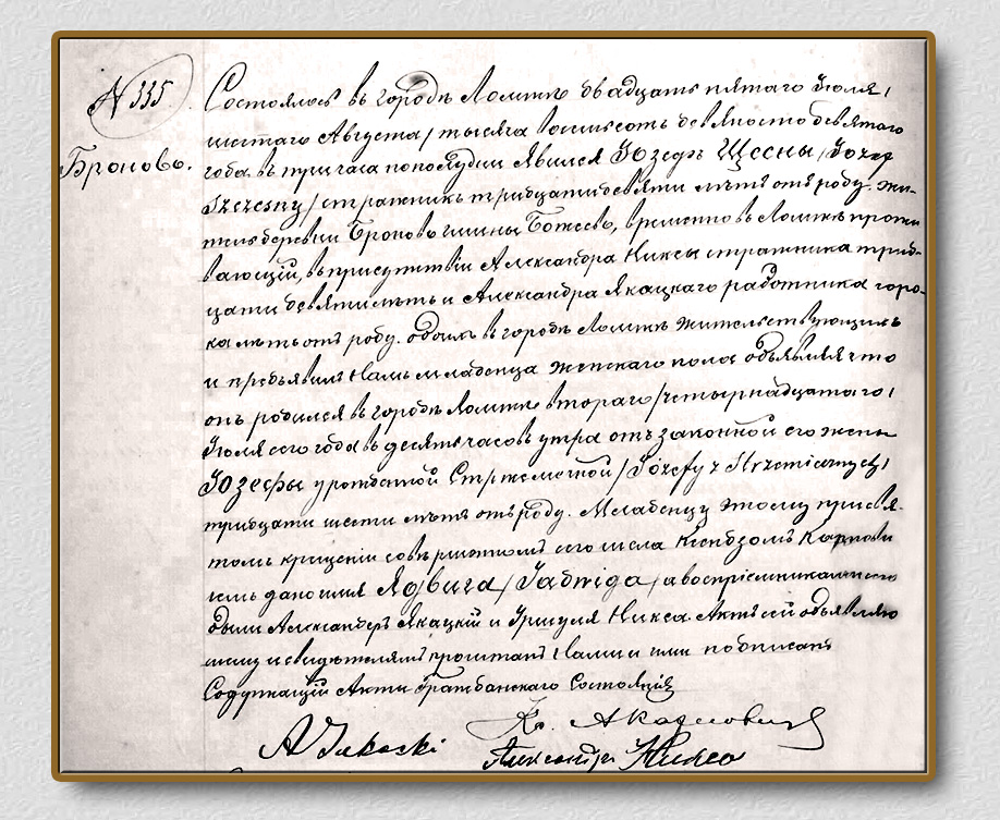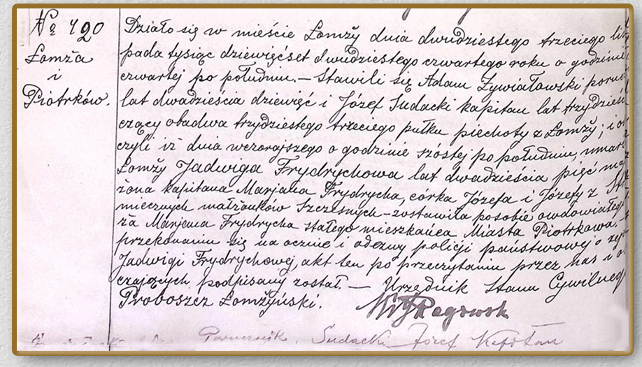 Akt ślubu, zawartego 09 września 1922 roku w łomżyńskim kościele katedralnym pomiędzy Jadwigą Szczęsną i kapitanem łomżyńskiego 33 Pułku Piechoty Marianem-Ludwikiem Frydrychem - urodzonym 14 sierpnia 1897 roku w Koluszkach, w pow. piotrkowskim /synem Jana i Marianny Wielgat-Rydzewskiej z męża Frydrych /.