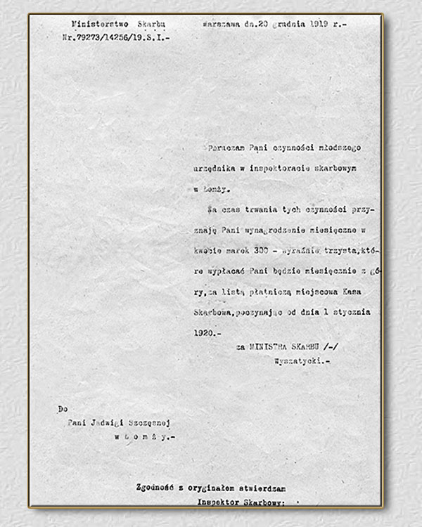 20-letnia Jadwiga Szczęsna rozpoczyna swoją pierwszą pracę, 01 stycznia 1920 roku w inspektoracie skarbowym, w Łomży, na stanowisku młodszego urzędnika.