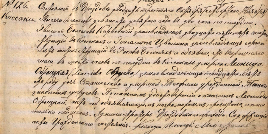 Kopia oryginału aktu zgonu Leonidy Obryckiej /z d. Cwalina/ - żony zmarłego Romana Obryckiego - zmarłej 03 października 1899 r.