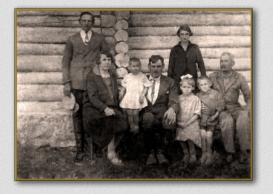 Skrobotuny, 1922 rok. Pod ścianą stoi Maria Szanter. Na ławce, od lewej, siedzi Franciszka Czyba - siostra Antoniego Szanter /męża Marii/ - siedzącego na ławce, naprzeciw żony Marii. Ostatni mężczyzna po prawej, to prawdopodobnie ojciec Antoniego Szantera. Ostatni, po lewej, to mąż Franciszki Czyba - siostry Antoniego Szantera. Troje dzieci - na fotografii, to potomstwo Franciszki i jej męża - Czybów.