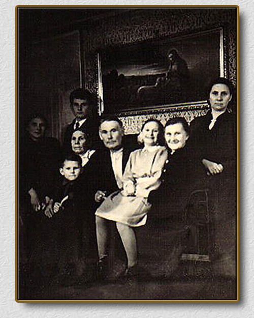 Rodzina Szanterów - Skrobotuny, rok 1943. Od lewej: córka Franciszki Czyba /siostry Antoniego Szantera/, siedząca Maria Szanter, stojąca za Marią jej córka - Alfreda Szanter, stojący obok Marii syn Olgierd, stojący za nim syn Szanterów - Edward, siedzący ojciec - Antoni Szanter, stojąca za nim córka - Zofia, stojąca w pierwszym rzędzie córka Jadwiga i siedząca Franciszka Czyba - siostra Antoniego Szantera.