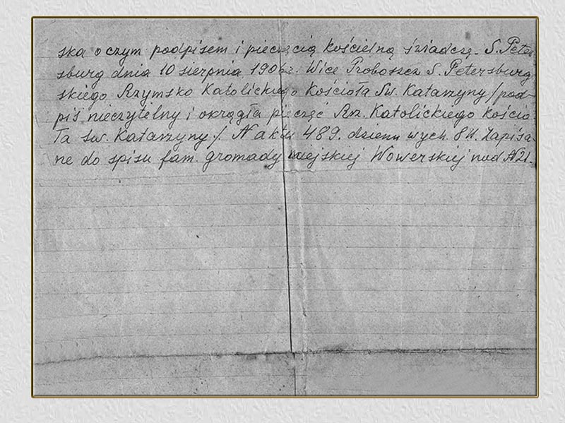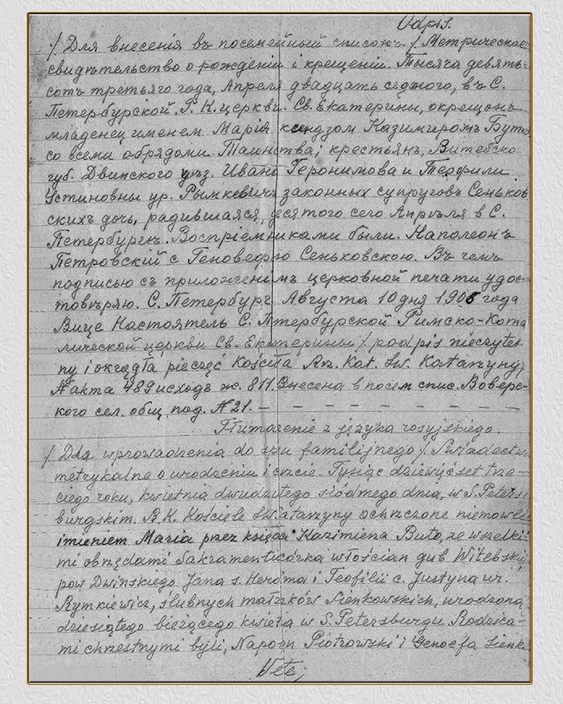Część II metryki urodzenia i świadectwa chrztu babci Marii Szanter /z domu Sieńkowskiej/ z własnoręcznie przez nią napisanym tłumaczeniem, z języka rosyjskiego, na polski.