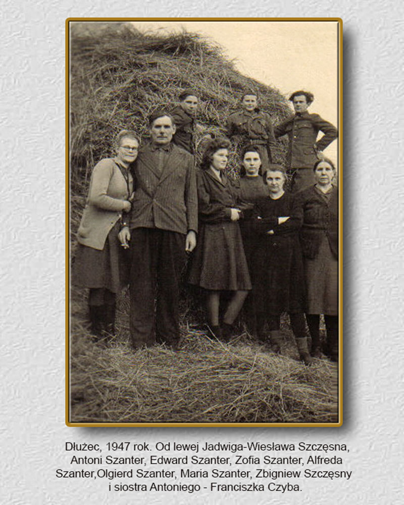 Dłużec , powiat lwówecki - rok 1948. Spotkanie rodzinne po przyjeździe rodziny Szanterów z wileńszczyzny, na Dolny Śląsk. Od lewej: Zbigniew Szczęsny /syn Czesława/, Jadwiga Wiesława Szczęsna /córka Czesława/, Maria Szanter z domu Sienkowska /siostra Zofii Szczęsnej/, Antoni Szanter /mąż Marii/, Alfreda Szanter /córka Antoniego i Marii/, Olgierd Szanter /syn Marii i Antoniego/, malutka Czesława Szanter /córka Marii i Antoniego/, Zofia Szanter /córka Marii i Antoniego/, niżej - Jadwiga Szanter /córka Marii i Antoniego/, z tyłu - Czesław Szczęsny, dalej z prawej - Franciszka Czyba /siostra Antoniego/, Jerzy Szczęsny /syn Czesława/ i ostatni z prawej strony - Edward Szanter /syn Marii i Antoniego/.