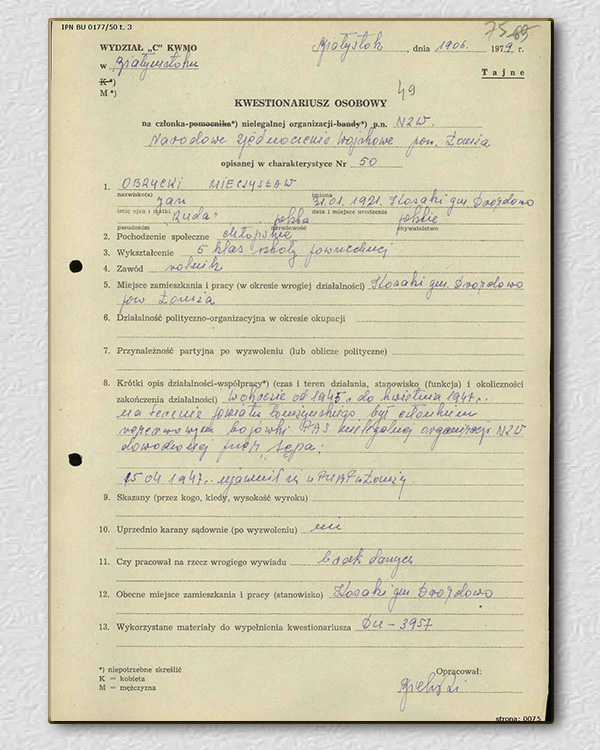 Kopia tajnej kartoteki założonej Mieczysławowi Obryckiemu przez Urzad Bezpieczenstwa w Białymstoku,dokumentującej jego przynależność do antypaństwowej organizacji Narodowego Zjednoczenia Wojskowego /NZW/ w której działał pod pseudonimem "Ruda".