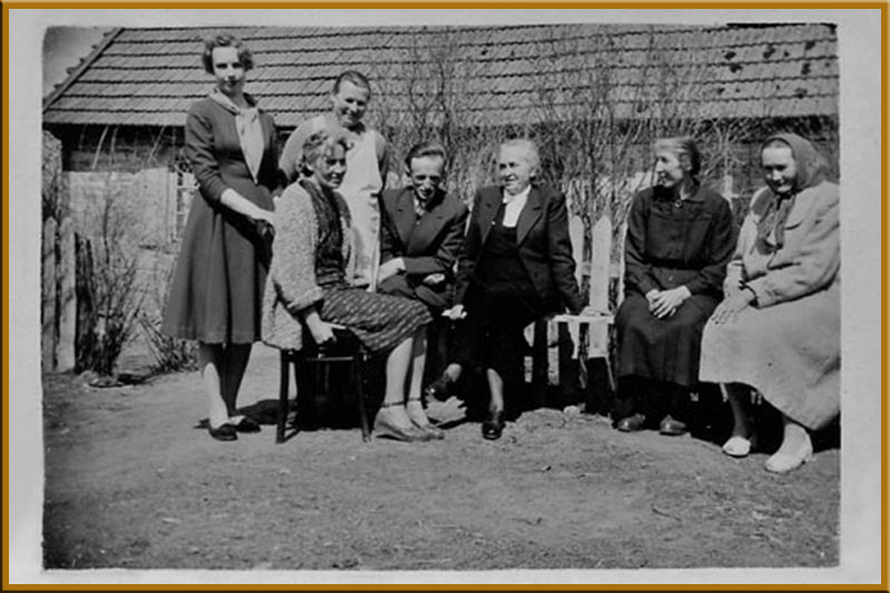 Lato 1950 roku, Kossaki-Ponikly Stok - Wiktoria Obrycka z synami. Od lewej: Janusz Obrycki, półroczna Maria Barbara Obrycka - trzymana na rękach przez ojca Mieczysława Obryckiego, Wiktoria Obrycka - trzymająca trzyletnią Jolantę Radziej - córkę Haliny Obryckiej i Michała Bierzyńskiego , Bohdan Obrycki i Zdzisław Obrycki.