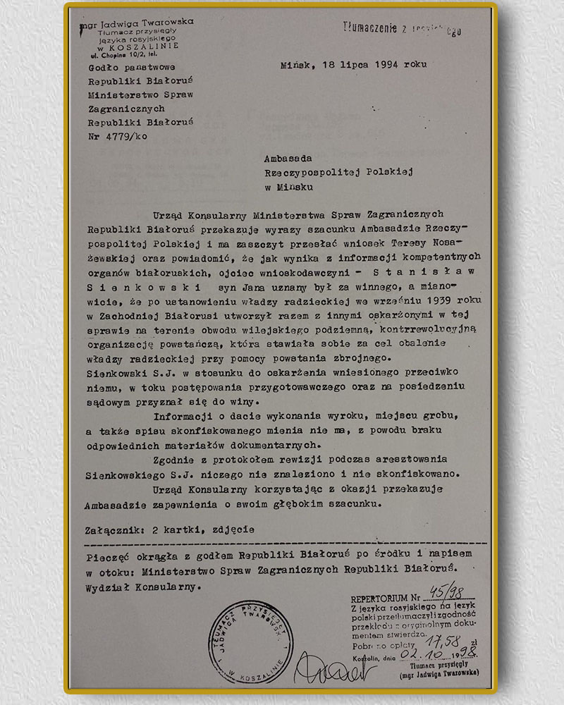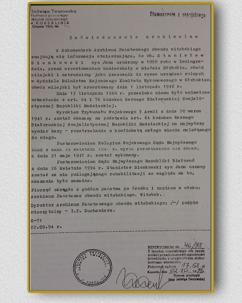 Po orzeczeniu wyroku, na Stanisławie Sieńkowskim, NKWD zatrzymało jego żonę Stefanię i pięcioro dzieci - w wieku od dwóch do trzynastu lat. Powiedziano im, że zostają zabrani do ich ojca i męża - Stanisława. Wsadzono ich do wagonu kolejowego i wywieziono na Syberię , do miasta Barnauł w Kraju Ałtajskim, gdzie spędzili pięć lat zanim pozwolono im wrócić z powrotem do Polski, w 1946 roku. Dopiero po ponad 50 -ciu latach dowiedzieli się, że ich ojciec i mąż został zamordowany w poklasztornym NKWD-owskim miejscu kaźni w Berezwecz, na przedmieściu miasta Głębokie, gdzie mieszkali.