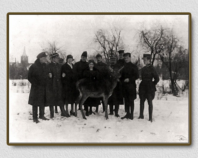 Okolice Wilna - 1919 rok. Ceremonia podarowania sarny, marszałkowi Józefowi Piłsudskiemu. Czwarty od prawej - marszałek Piłsudski, drugi od prawej - obok marszałka Józefa Piłsudskiego - podporucznik Stanisław Sieńkowski.