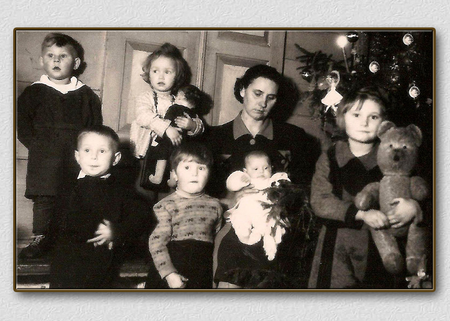 Dolny Śląsk - Dłużec, Boże Narodzenie 1953 roku. Dłużec, Boże Narodzenie 1953 roku. Od lewej /wyżej/: Lech Szczęsny i Elżbieta Szczęsna /z lalką/, siedząca w środku - Alfreda Szanter /poźniej z męża Karpowicz/ - trzymająca na kolanach Teresę Szczęsną /poźniej z męża Wojtaczka/, stojący niżej - pierwszy od lewej - Władyslaw Szczęsny, drugi stojący od lewej - Bohdan Szczęsny i stojąca z prawej strony zdjęcia - Czesława Szanter /siostra Alfredy/.