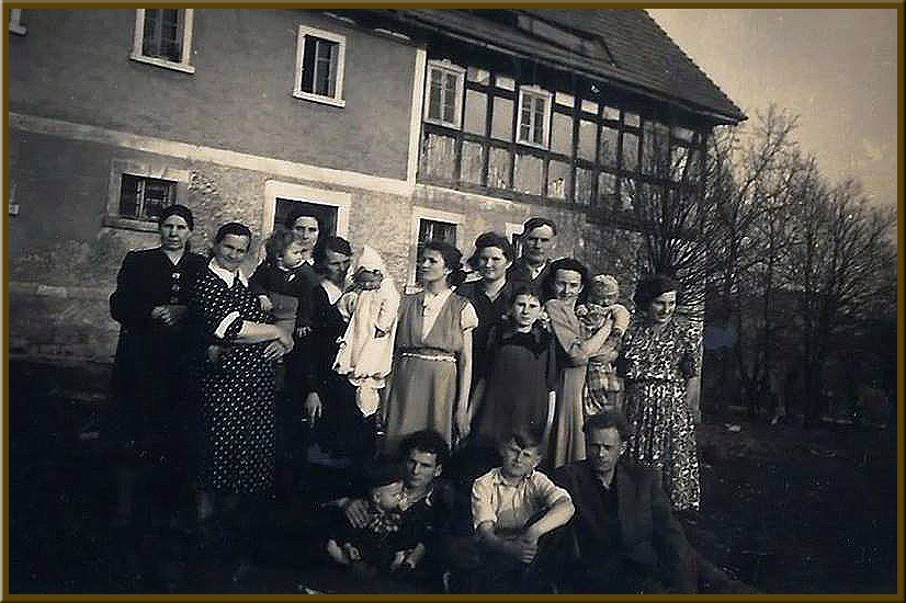 Dolny Śląsk - Dłużec , powiat lwówecki, lato 1952 roku. Zdjęcie zrobiono na tle domu Szanterów w Dłużcu, który otrzymali /w ramach umowy przesiedleńczej pomiędzy rządami Polski i ZSRR/ w zamian za pozostawioną posiadłość we wsi Skrobotuny , w gminie Prozoroki, w rejonie wileńskim. Od lewej stoją: Franciszka Czyba - siostra Antoniego Szantera, Stefania Sieńkowska trzymająca na rękach Władyslawa Szczęsnego. Obok stoi Maria Szanter trzymająca na rękach Leszka Szczęsnego. Z tyłu za nimi stoi Alfreda Szanter. Stojąca pośrodku /między Marią Szanter i Zofią Szczęsną/ to Teresa "Lalka" Sieńkowska. Najwyższy mężczyzna, stojący z prawej strony zdjęcia, to Antoni Szanter - mąż Marii Szanter - naprzeciw Antoniego, stoi ich córka - Jadwiga. Obok nich /bardziej do prawej/ stoi Irena Szczęsna, trzymająca kilkumiesięczną córkę Elzbietę Szczęsną i Helena Korzeniowska - siostra Ireny Szczęsnej. Jerzy Szczęsny - mąż Ireny jest ostatnim, po prawej stronie, siedzącym na ziemi. Obok Jerzego siedzi 13-letni Olgierd Szanter - syn Marii i Antoniego. Następny, siedzący na ziemi, to Eugeniusz Sieńkowski - trzymający Bohdana Szczęsnego.