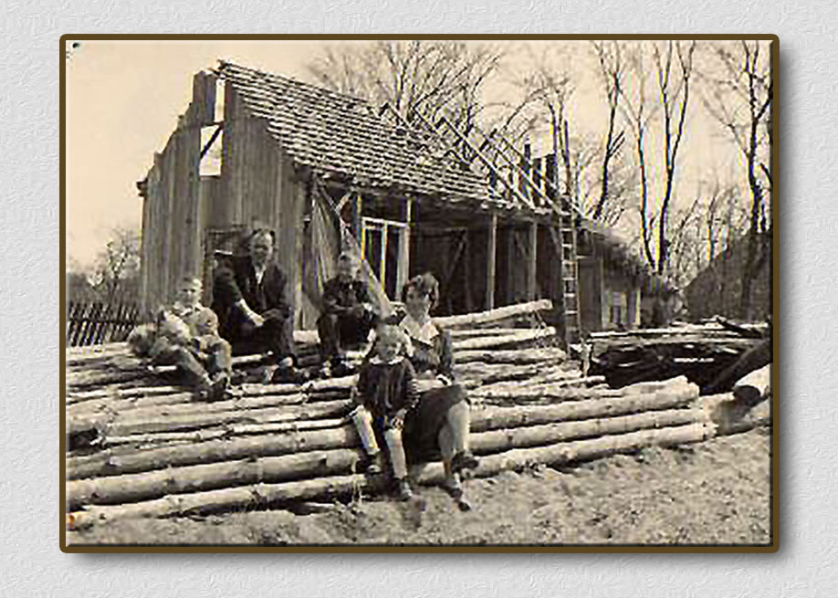 Łomża - rok 1959. Budowa domu Szczęsnych przy ul. Spokojnej. Z przodu siedzi Zofia Szczęsna-Szanter z córką Emilią. Zbigniew Szczęsny siedzi z tyłu wyżej, z synem Leszkiem, z lewej strony zdjęcia i Władkiem po prawej stronie zdjęcia.