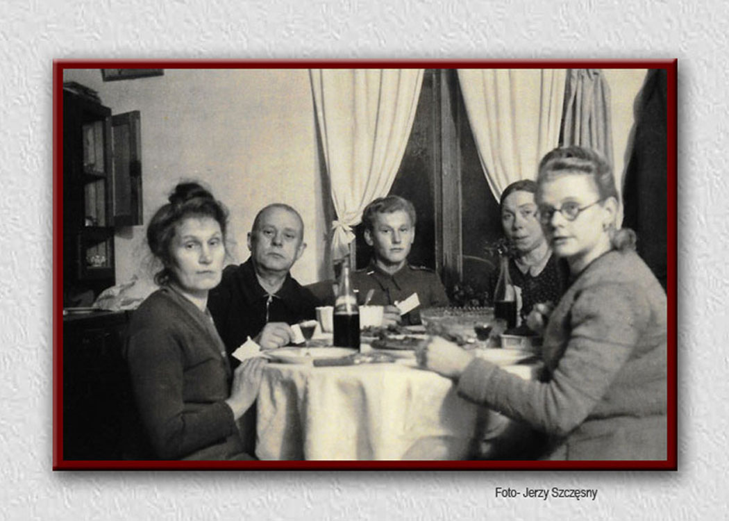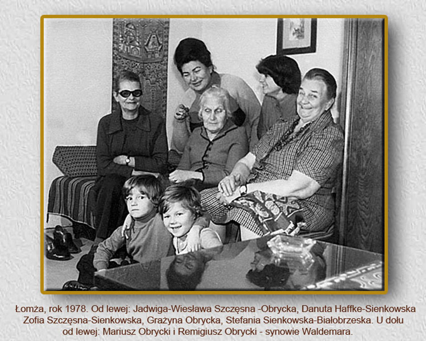 Łomża - kwiecień 1965 roku . Zdjęcie ze zjazdu rodzinnego na pogrzeb Franciszki Czyba - siostry Antoniego Szantera - męża Marii Szanter. Na zdjęciu od lewej: Teresa Szczęsna, Zofia Szczęsna, Władysław Szczęsny - trzymający Jacka Szczęsnego, Jadwiga Wiesława Obrycka-Szczęsna, Waldemar-Jacek Obrycki - syn Jadwigi, Olgierd Szanter syn Marii Szanter i Antoniego Szanter, babcia Zofia Szczęsna-Sieńkowska - trzymająca Mariana Obryckiego - syna Jadwigi Obryckiej-Szczęsnej, Maria Szanter - trzymająca Emilia Szczęsna, Alfreda Szanter - córka Marii Szanter, Jadwiga Szanter - siostra Alfredy i Zofii, Zbigniew Szczęsny, Lech Szczęsny, sąsiedzi Zbigniewa i Zofii - Hanna Kozłowska, Waldemar Kozłowski - syn Hanny, córka Hanny Kozłowskiej i ostatnia po prawej stronie zdjęcia - Czesława Szanter.