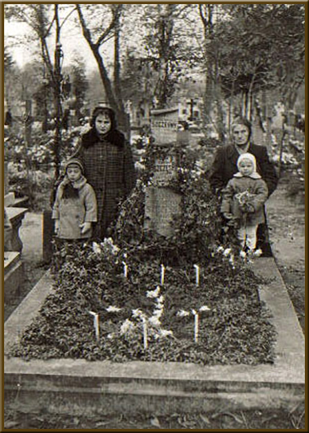 Łomża - październik 1954 roku. Rodzina Szczęsnych, przy grobie Czesława Szczęsnego - kapitana łomżyńskiego 33 Pułku Piechoty w pierwszą rocznicę jego śmierci. Od lewej: Zofia Szczęsna - żona Zbigniewa /syna Czesława/, Jadwiga-Wiesława Szczęsna-Obrycka - córka Czesława, Zofia Szczęsna - wdowa po Czesławie Szczęsnym, Jerzy Szczęsny - syn Czesława, Irena Szczęsna - żona Ludwika /syna Czesława/, Genowefa-Anna Szwetner - siostra Czesława.