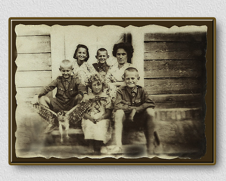 Jarnuty, pow. ostrołęcki, 1940 rok. Od lewej Ludwik Szczęsny, Natalia-Halina Grzybowińska, nieznana dziewczynka, Zbigniew Szczęsny, Zofia Szczęsna i Bogdan Szczęsny.