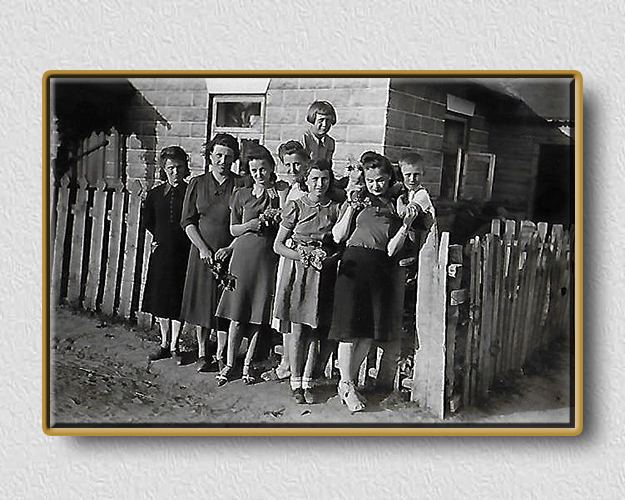 Jarnuty, pow. ostrołęcki, 1943 rok. Zofia Szczęsna /pierwsza z lewej strony zdjęcia/ i Natalia-Halina Grzybowińska /trzecia od lewej strony/ z sąsiadkami ze wsi Jarnuty